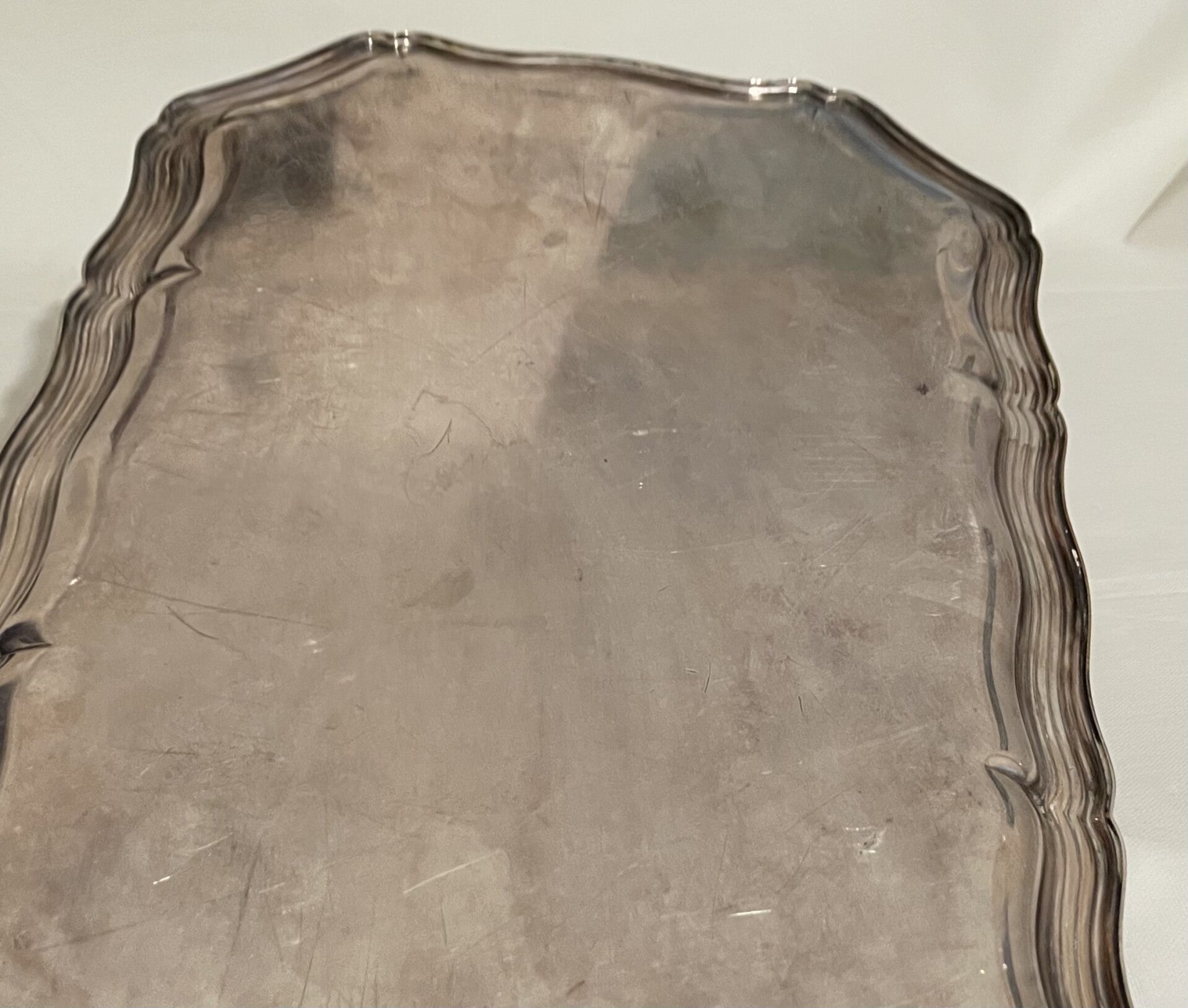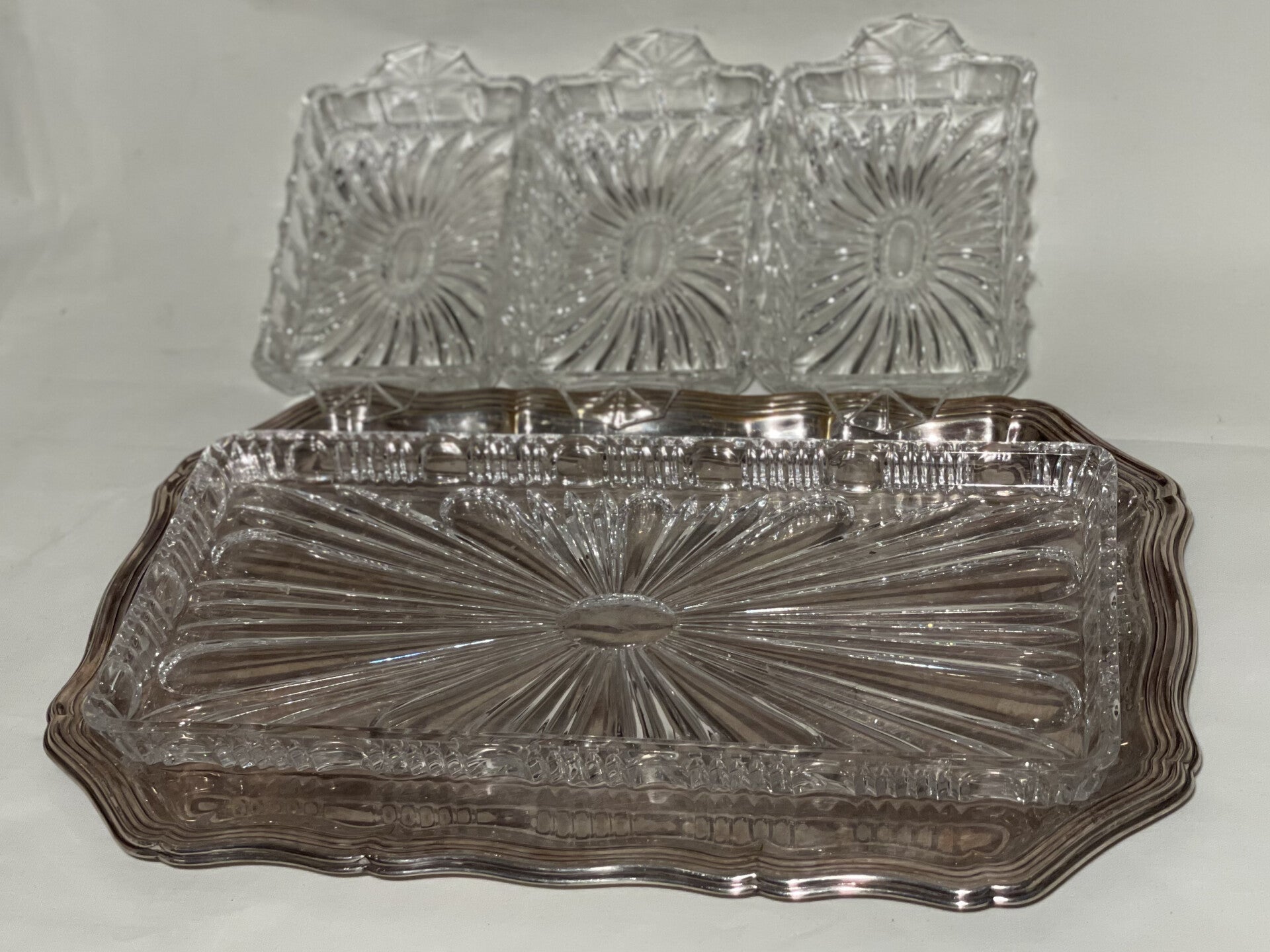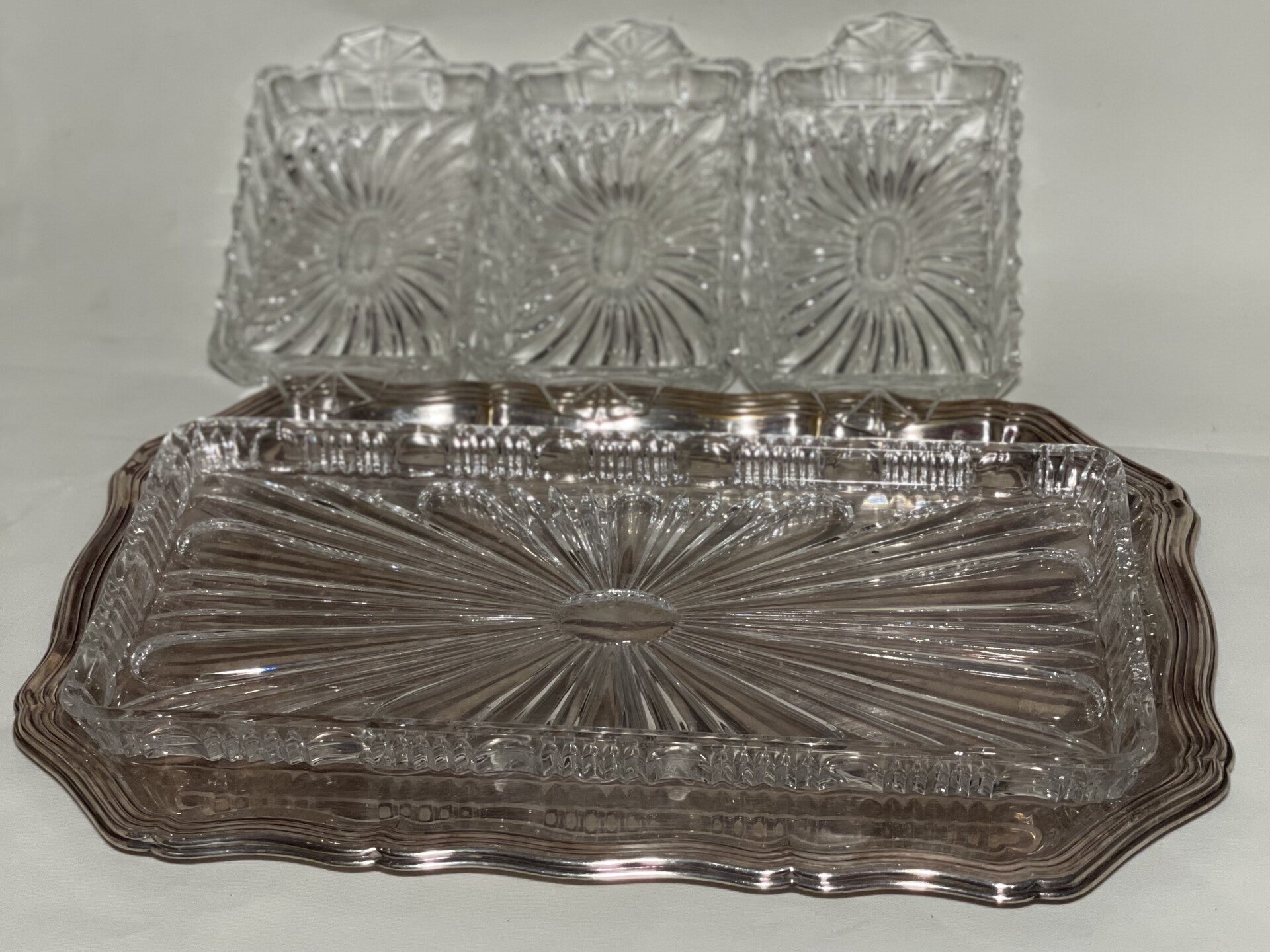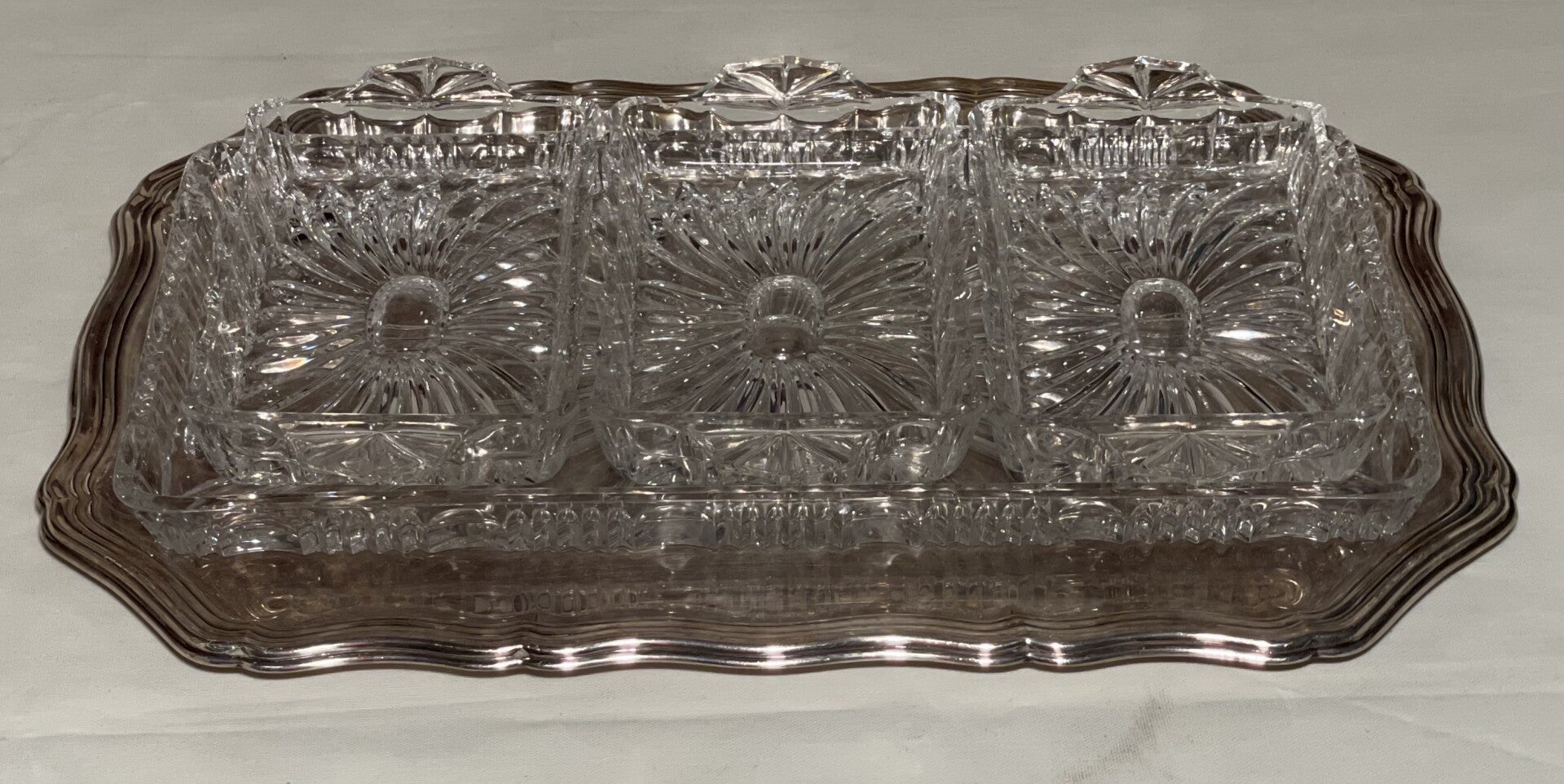 3 kristallen schaaltjes op bijbehorende kristallen dienblad op verzilverde dienblad.