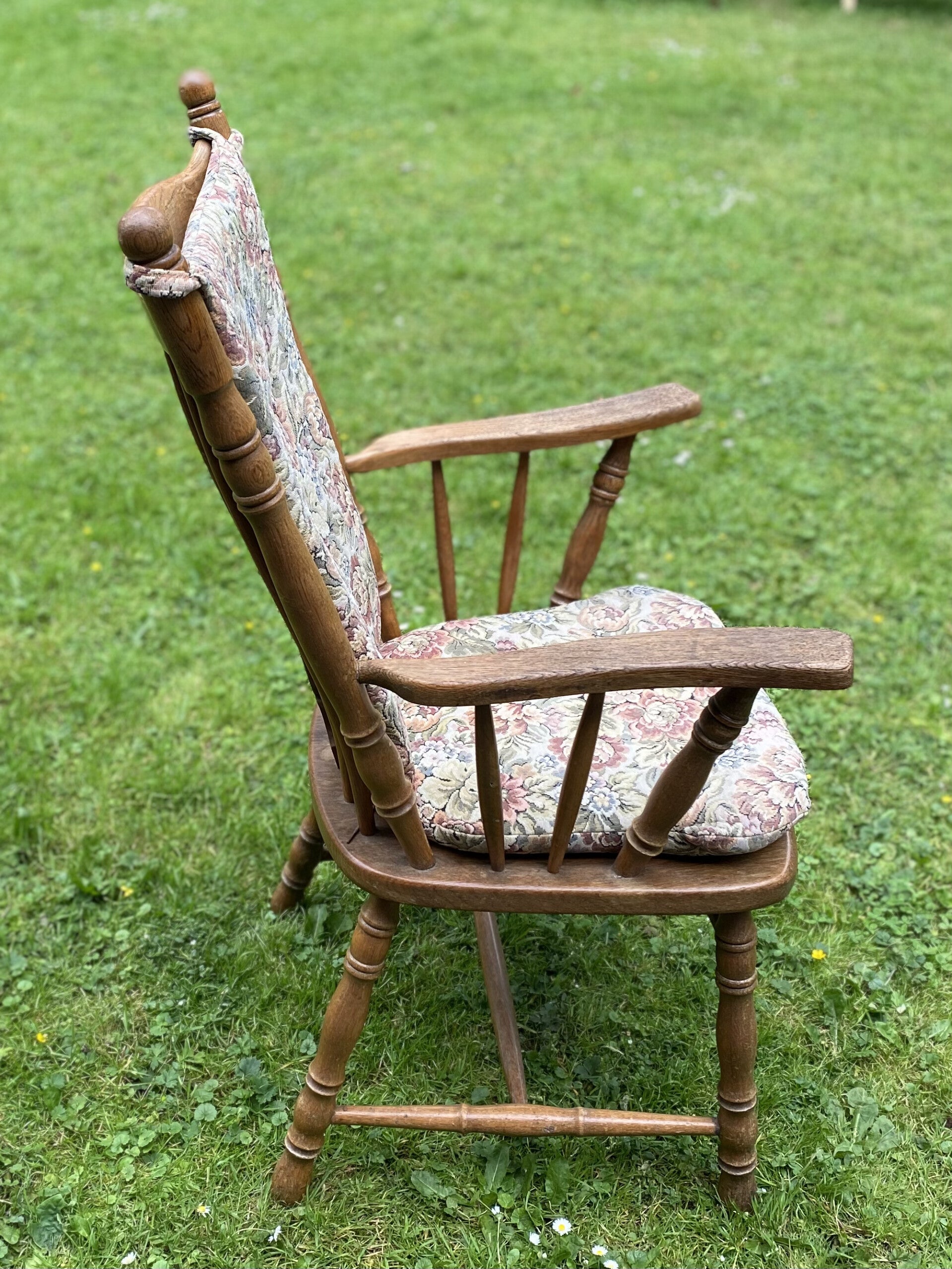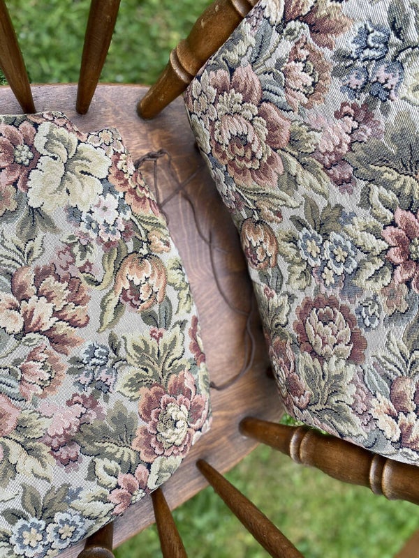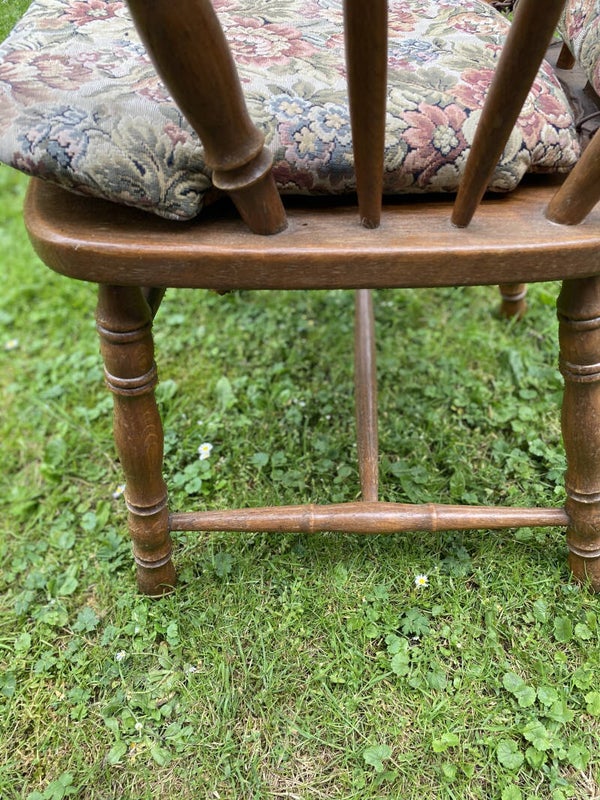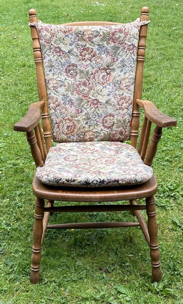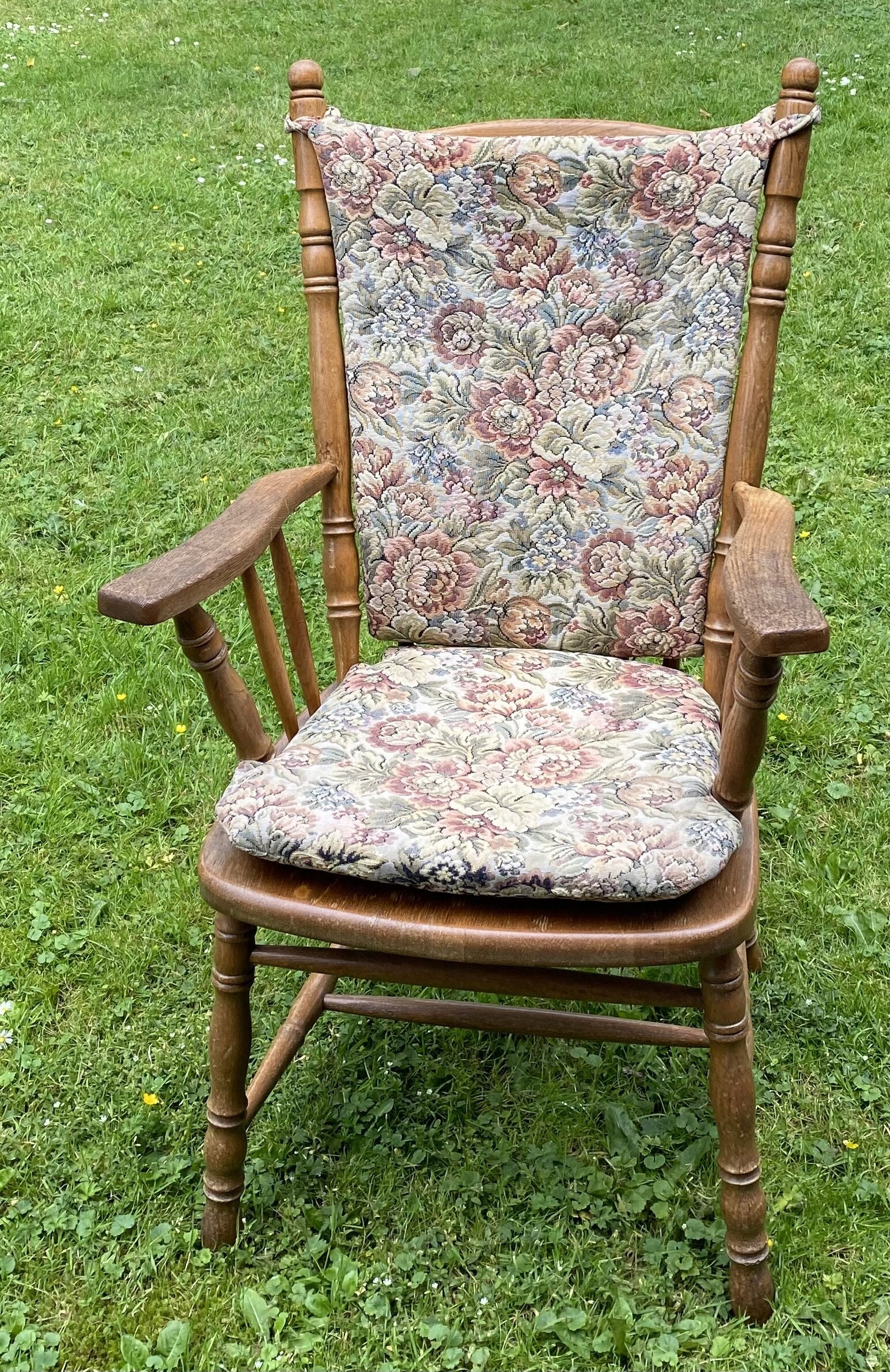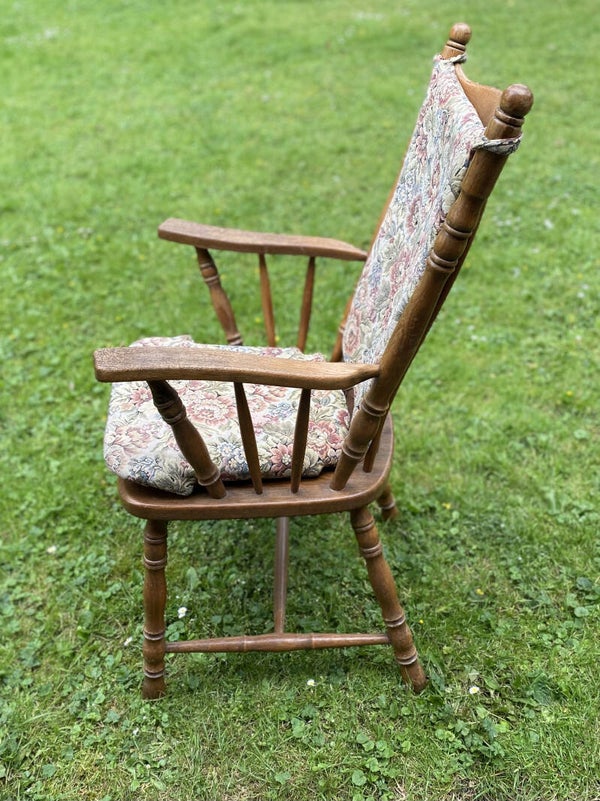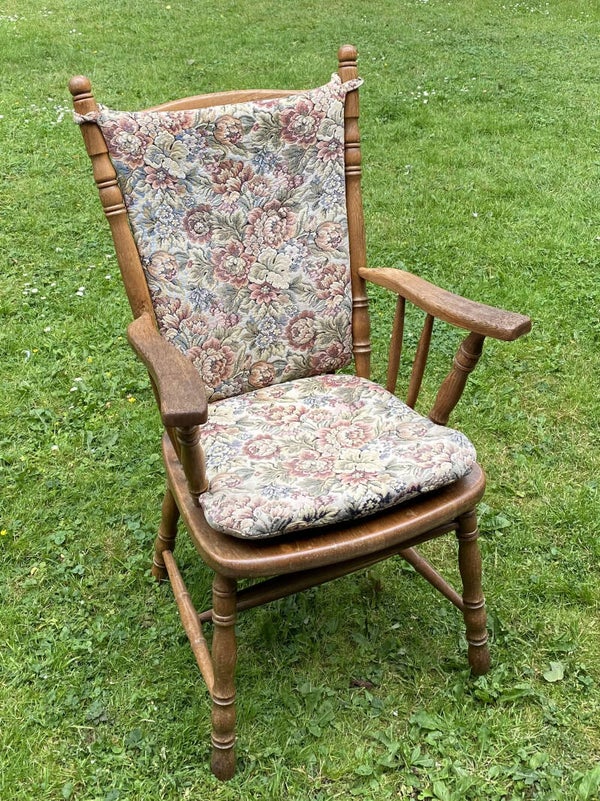 Antieke stoel met rug en zit kussentjes.