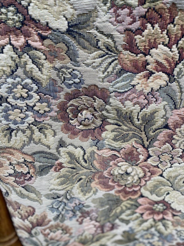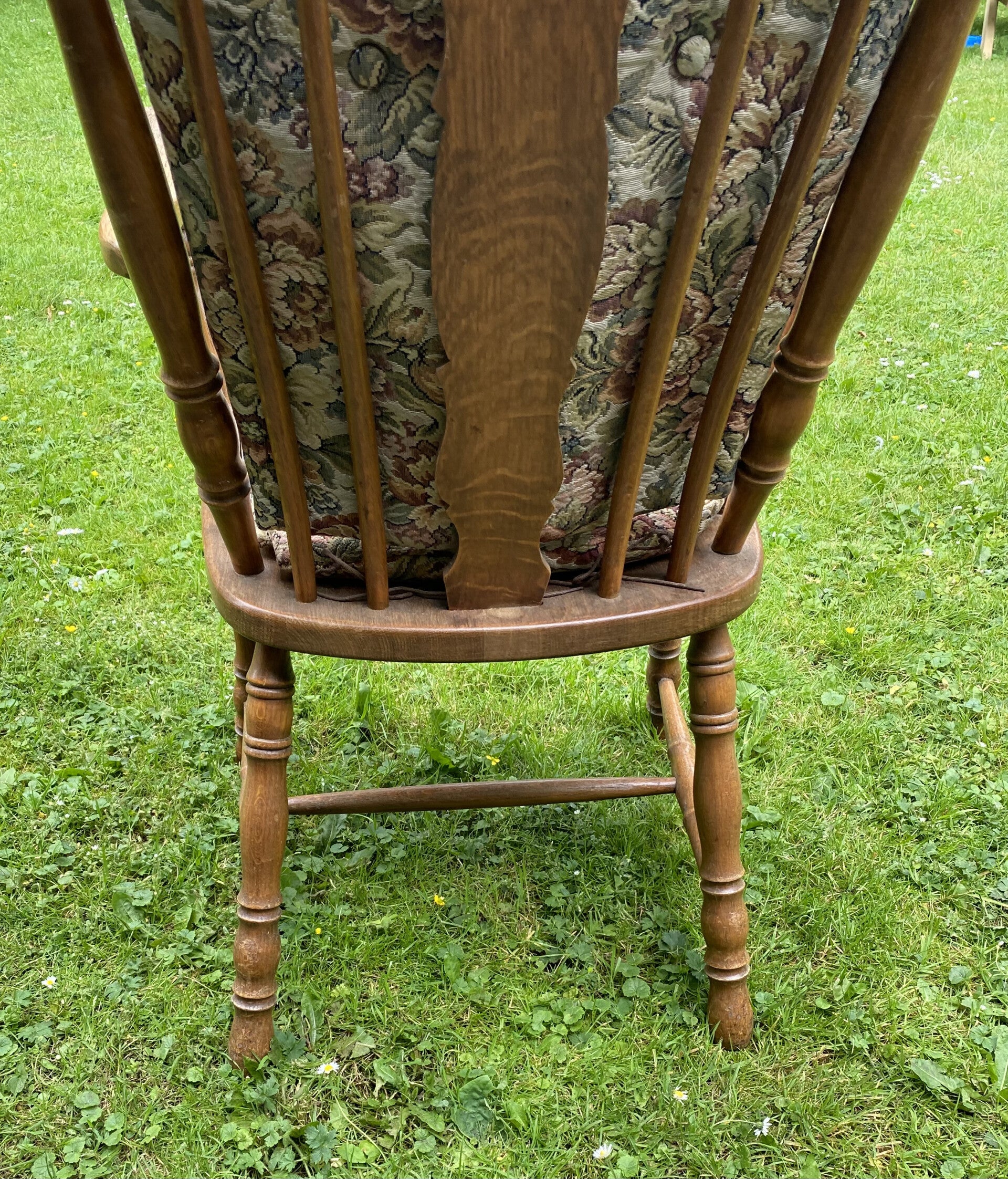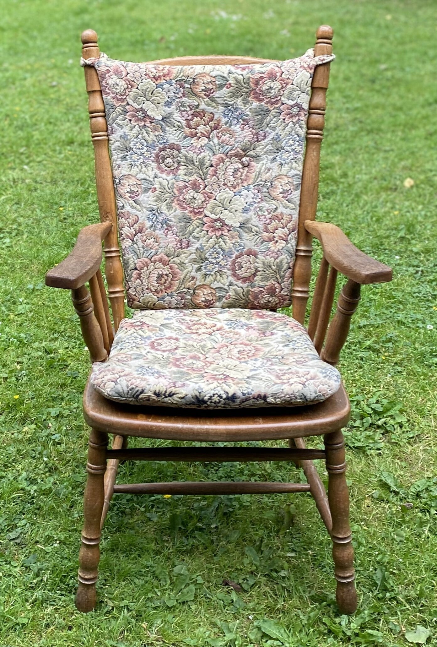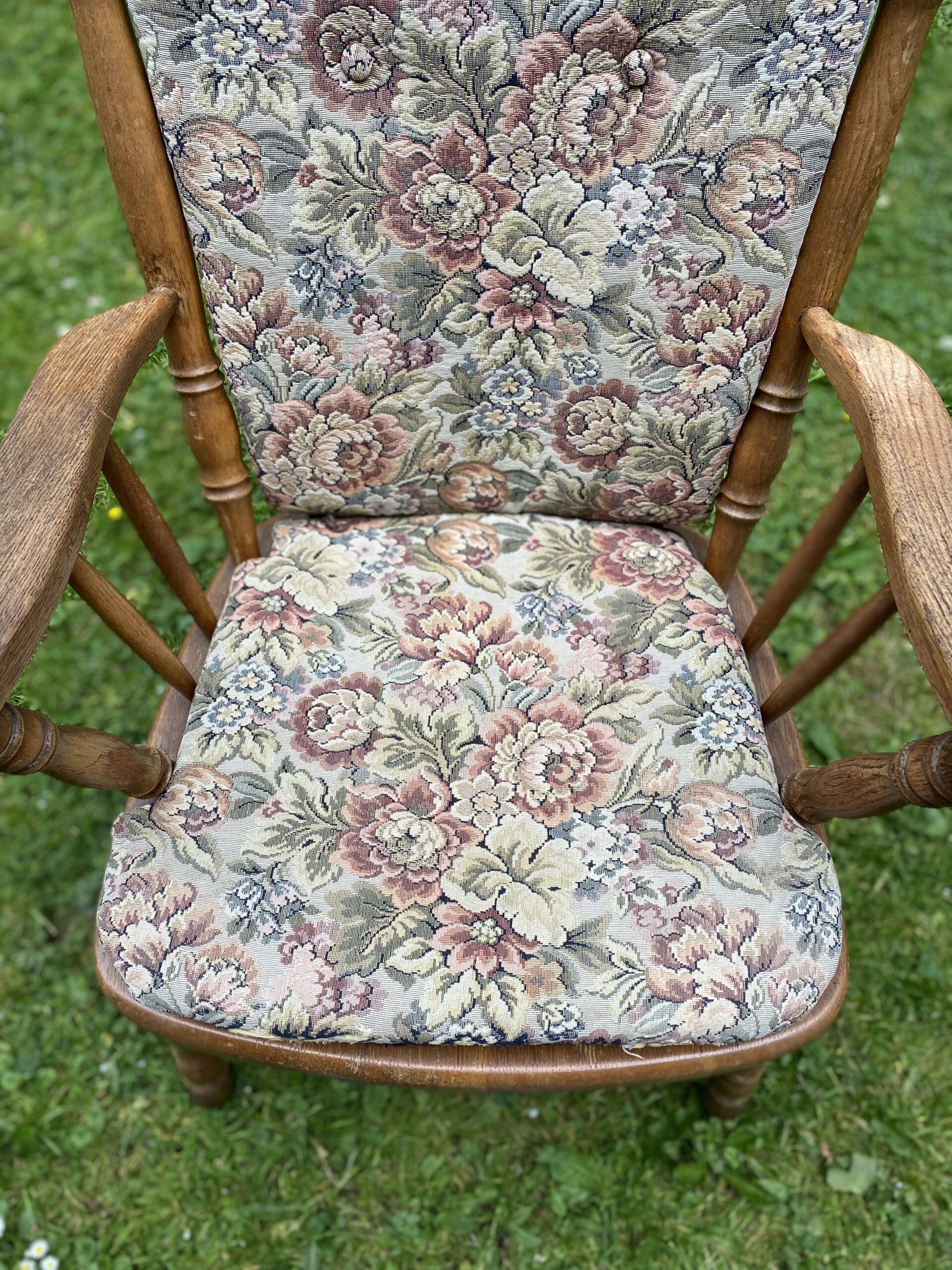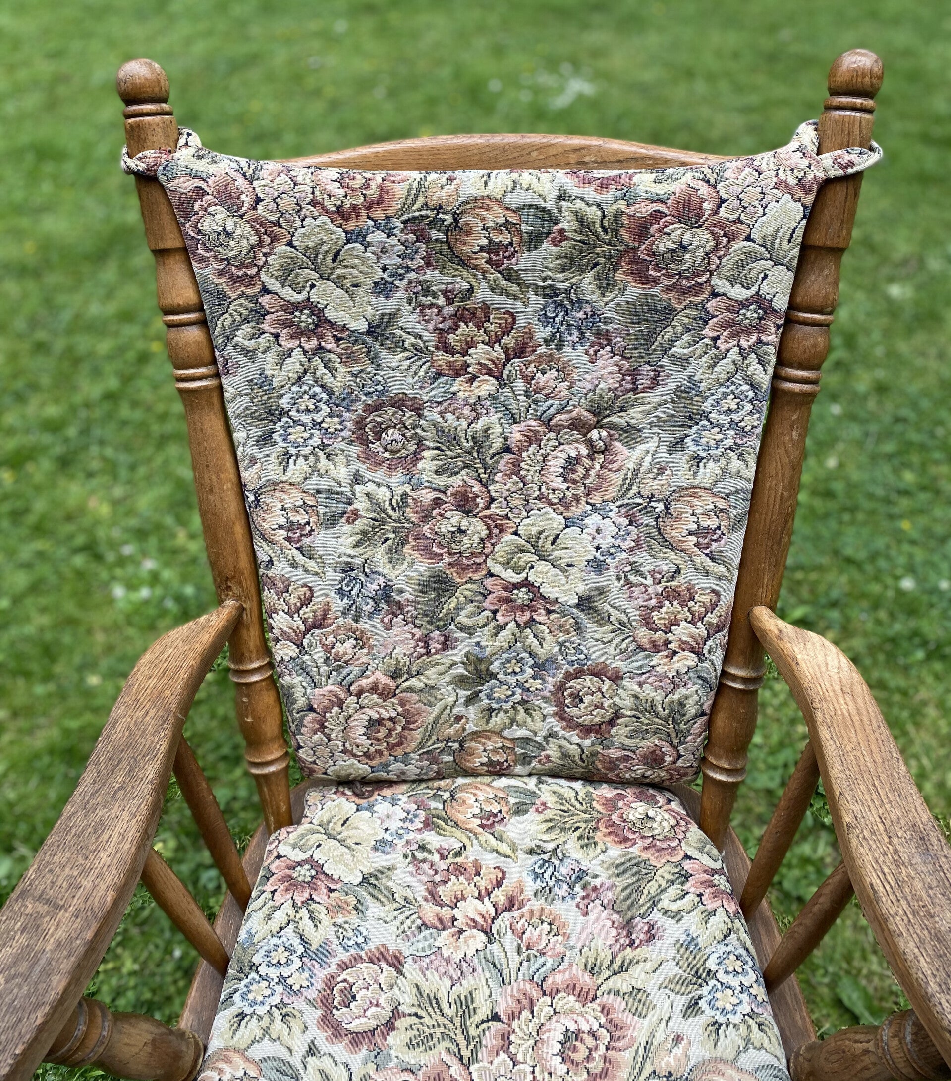 Antieke stoel met rug en zit kussentjes.