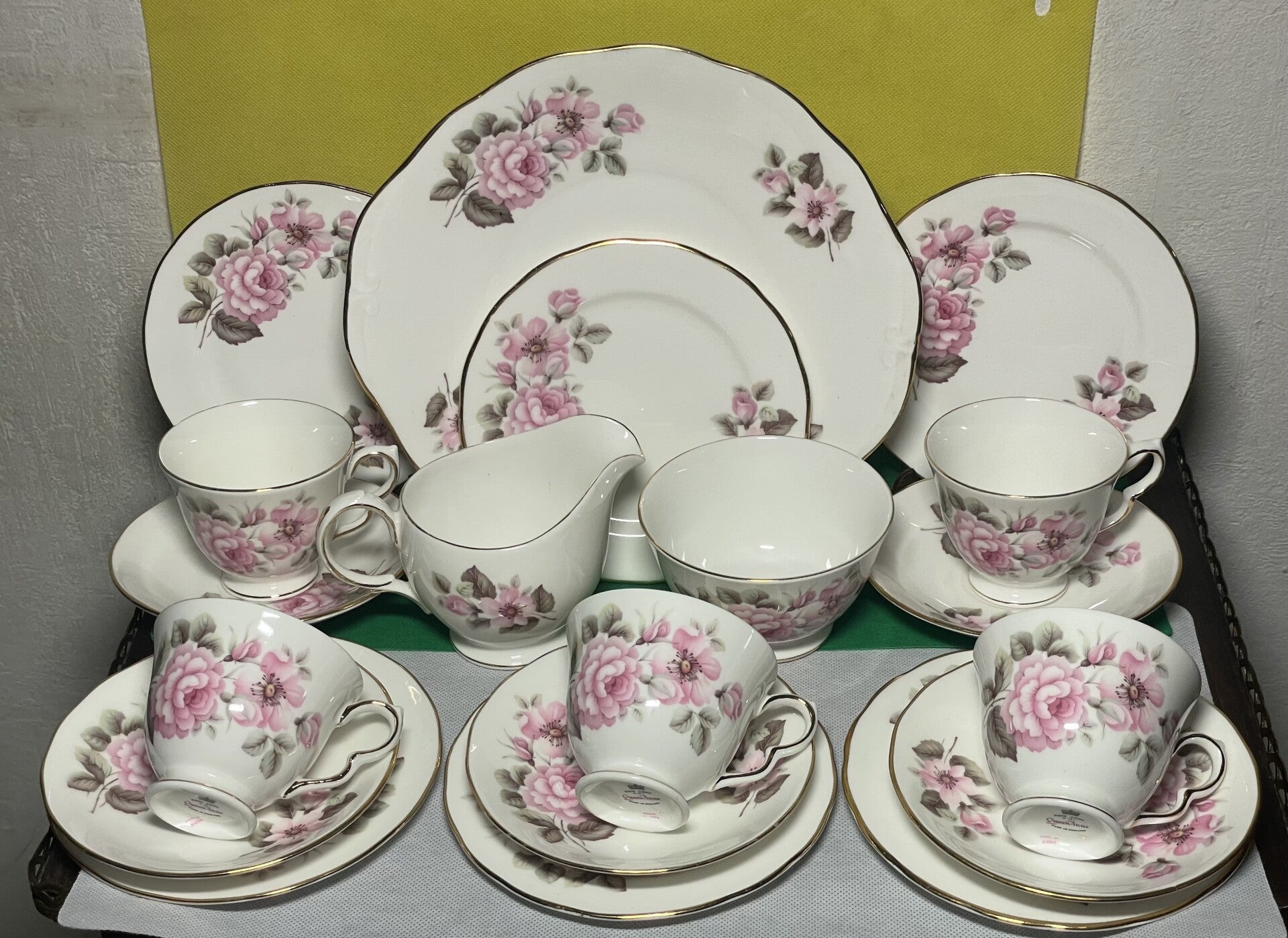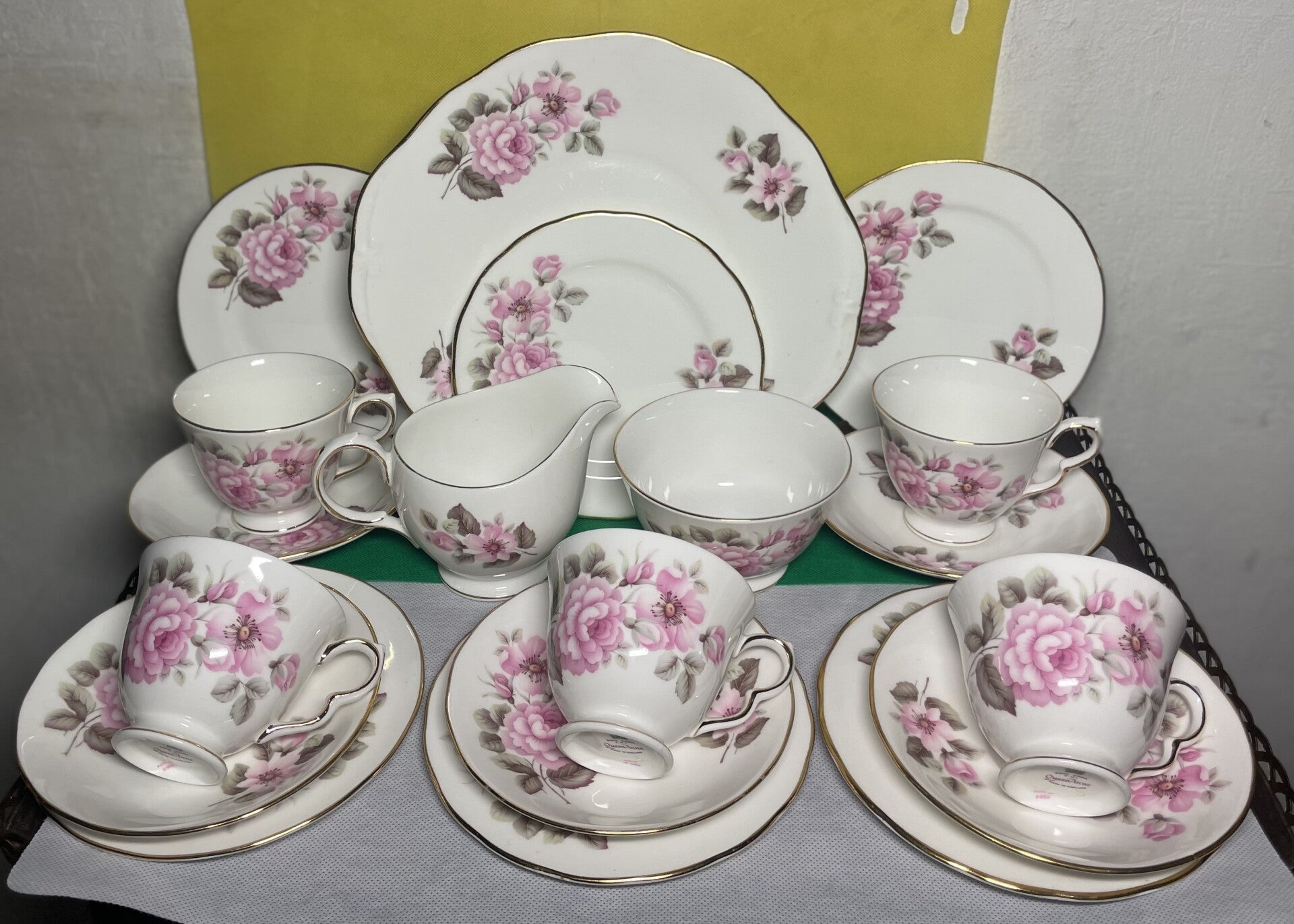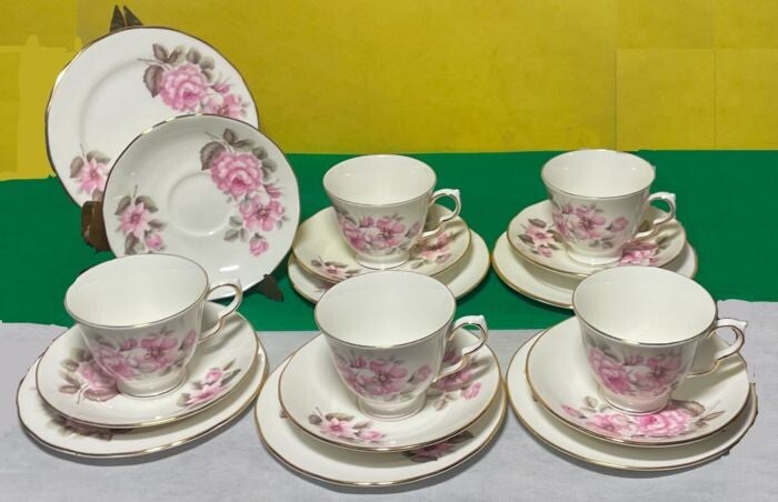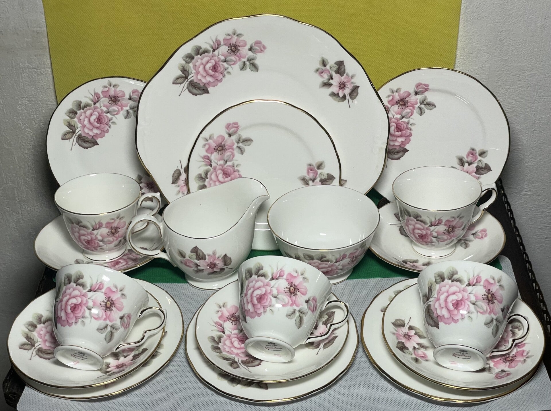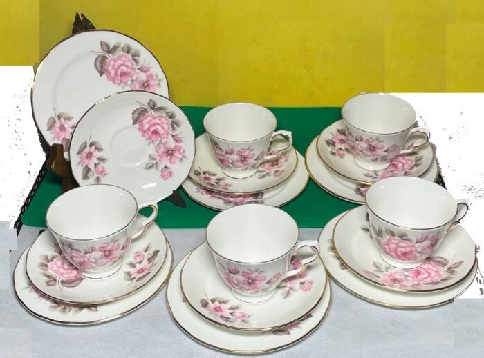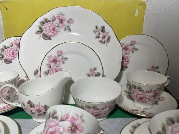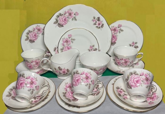 Prachtig Engels 'Queen Anne' Bone china gebak en koffieservies. Bestaande uit 5 kop en schotels, 6 dessertborden, een gebaksschaal, een suikerpot en melkkan. (+ 1 extra schoteltje) Allemaal met prachtig roze bloemmotief en goudgestreepte randen. Alle stukken zijn gemerkt.