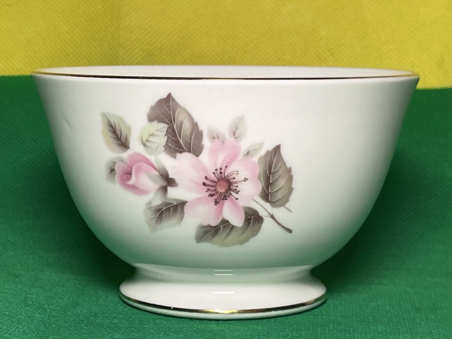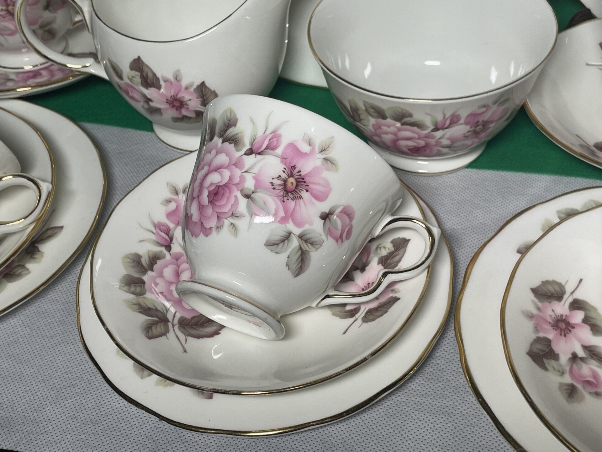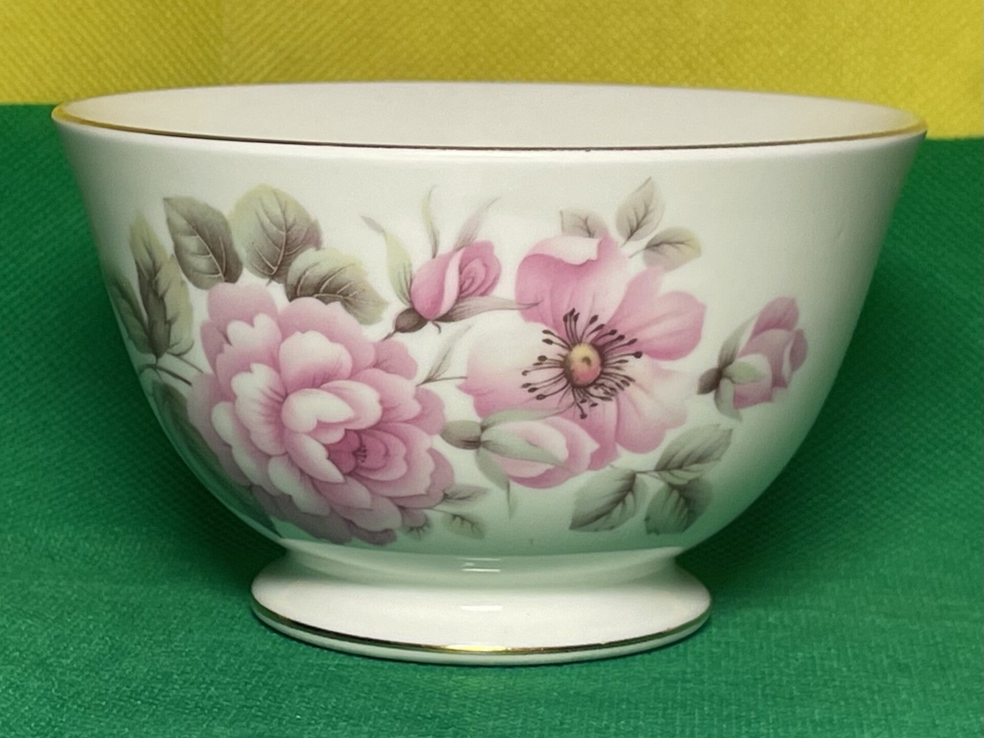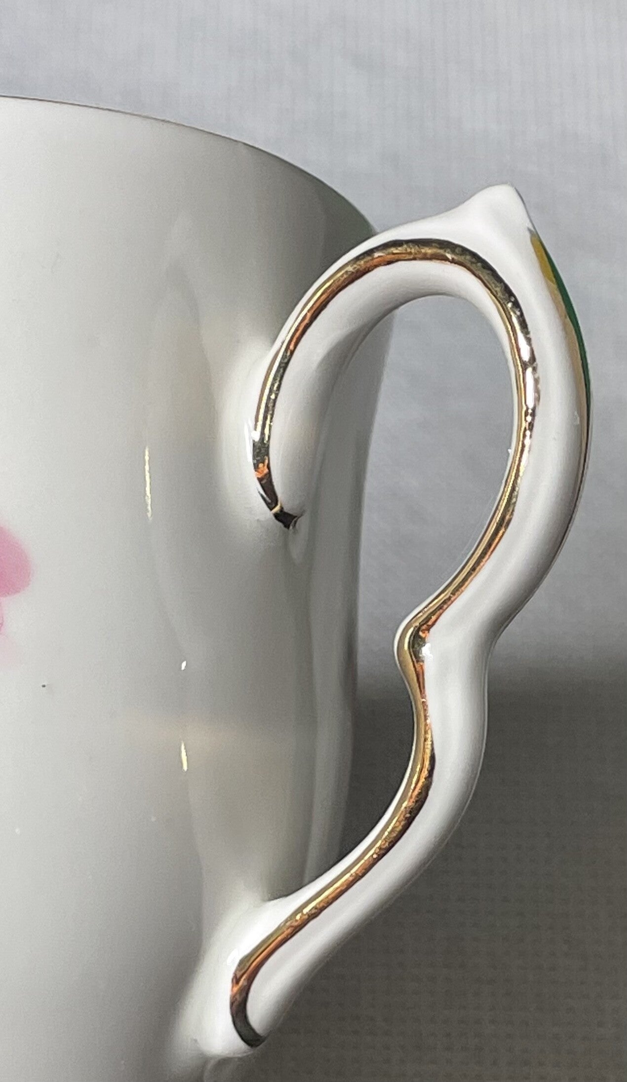 Prachtig Engels 'Queen Anne' Bone china gebak en koffieservies. Bestaande uit 5 kop en schotels, 6 dessertborden, een gebaksschaal, een suikerpot en melkkan. (+ 1 extra schoteltje) Allemaal met prachtig roze bloemmotief en goudgestreepte randen. Alle stukken zijn gemerkt.