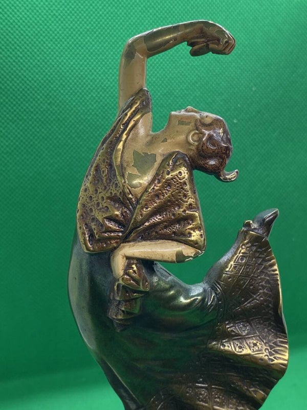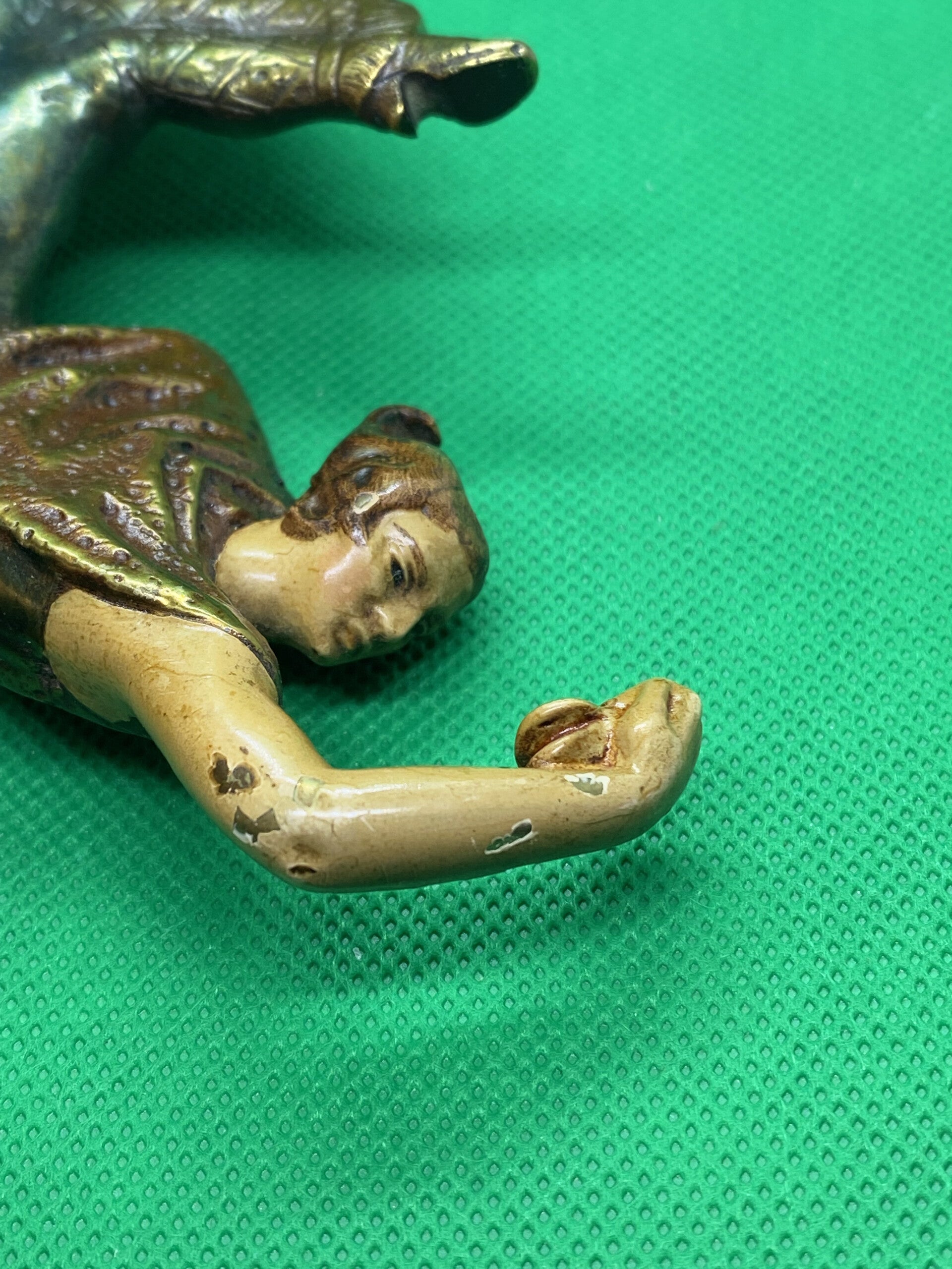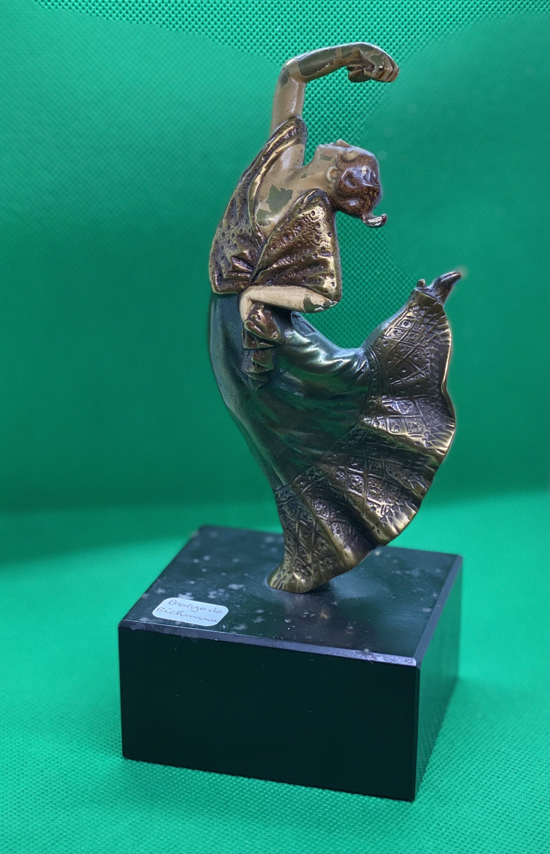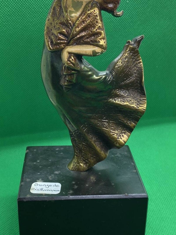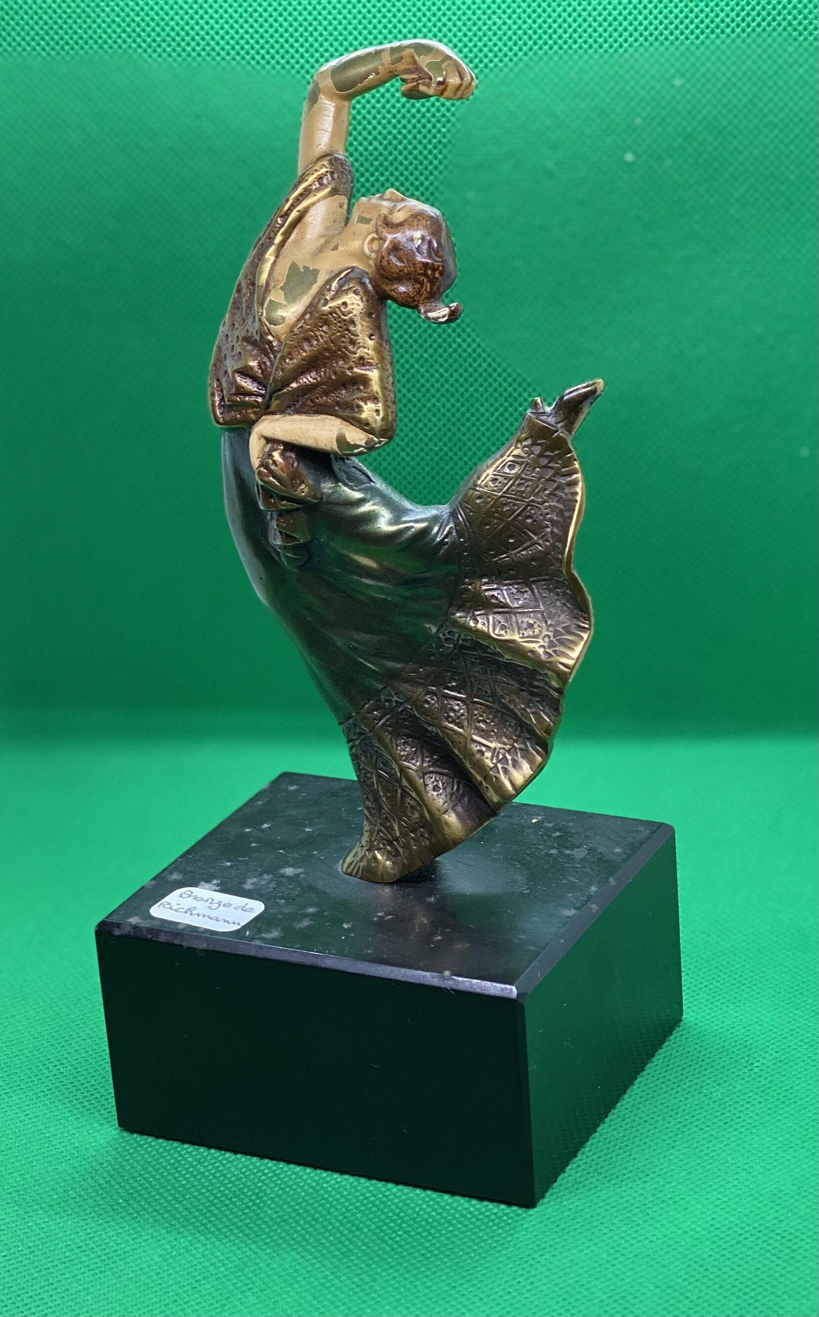 Prachtig antiek bescheiden Art Deco brons met emaille sculptuur op marmeren voet van een dansende dame van Ernst Rischmann. Het beeld heeft zeer mooie gedetailleerde gravures.Sculptuur is gegraveerd: 'bronze rischmann'.