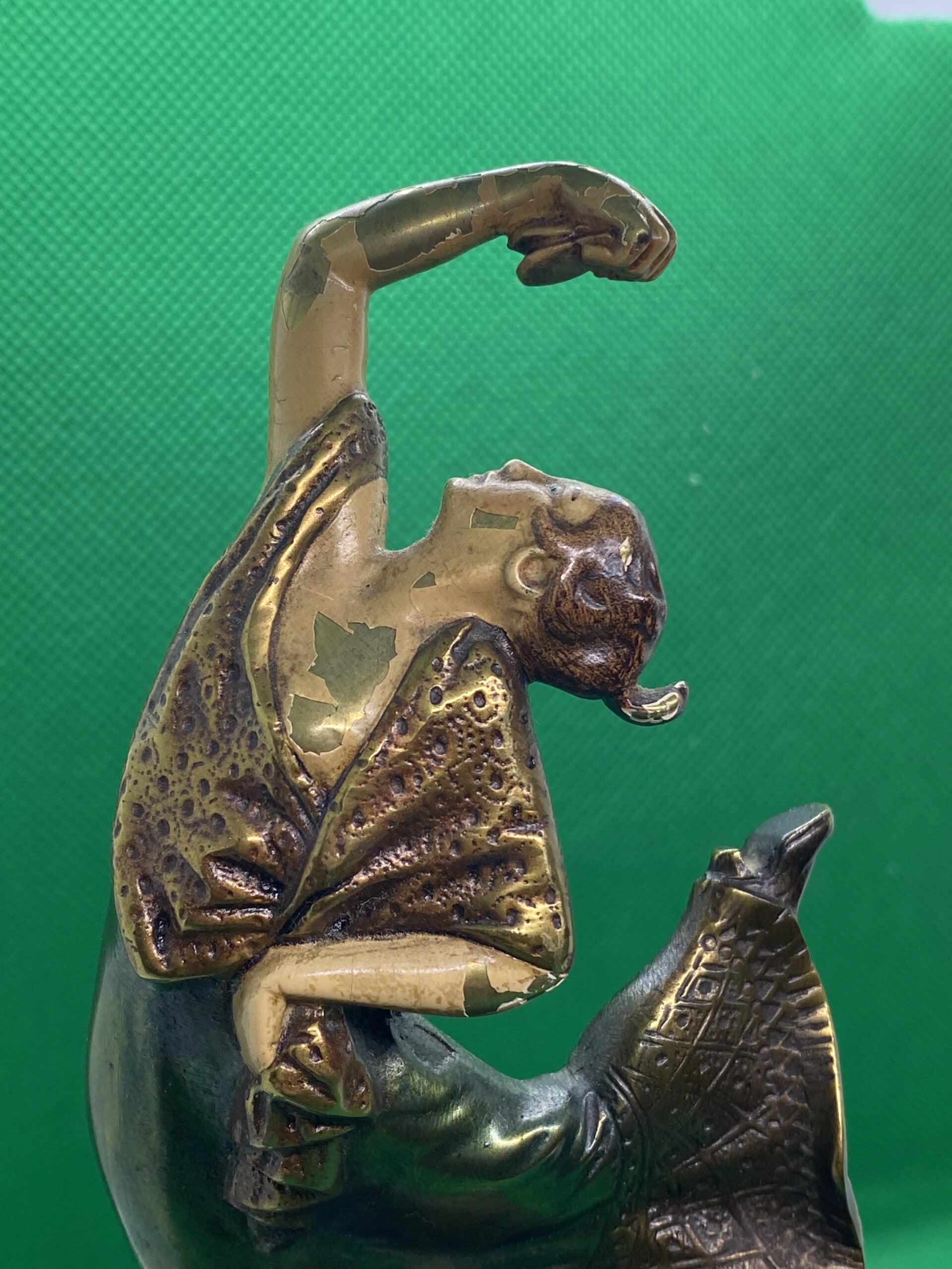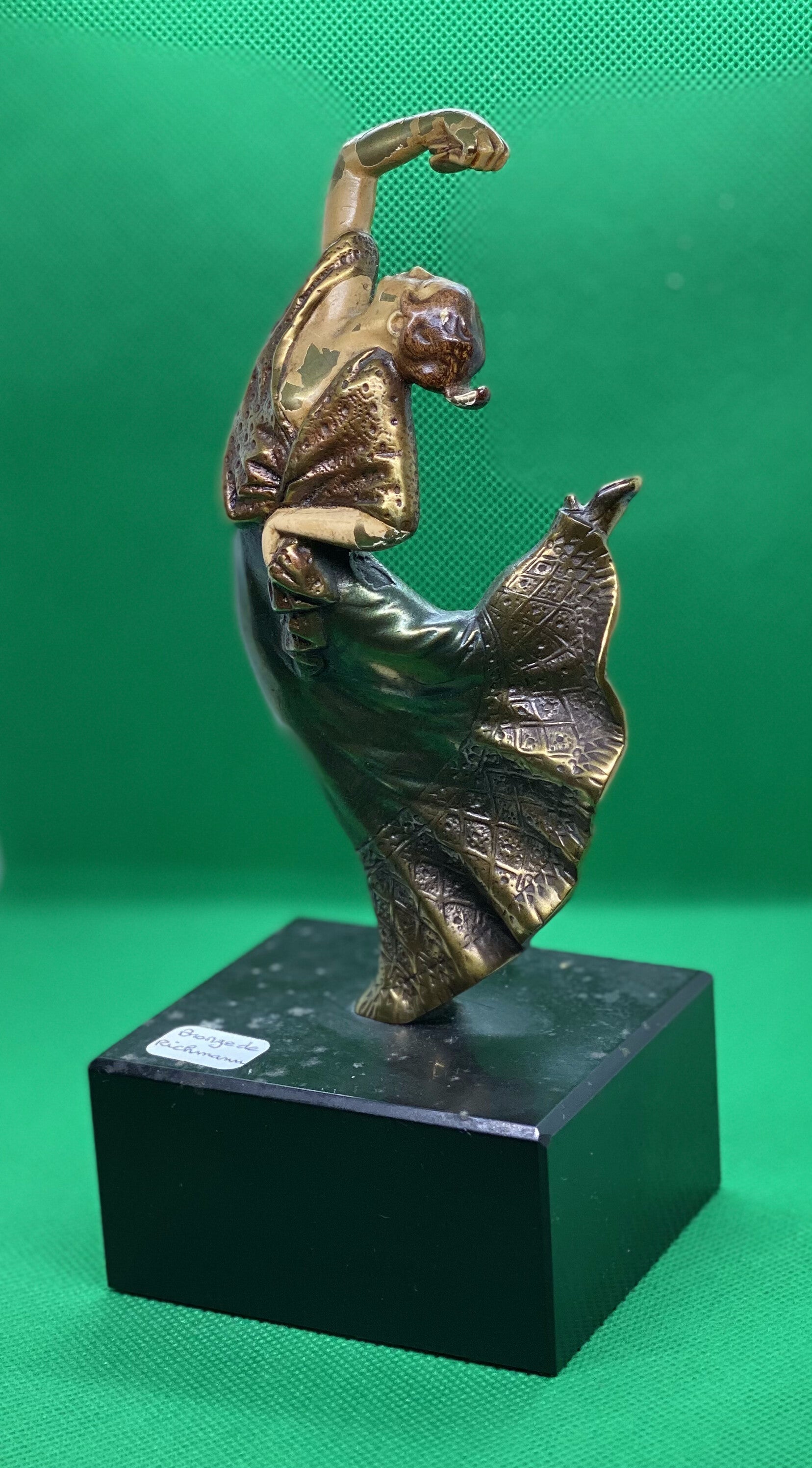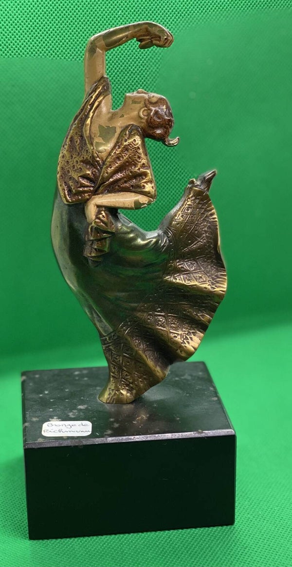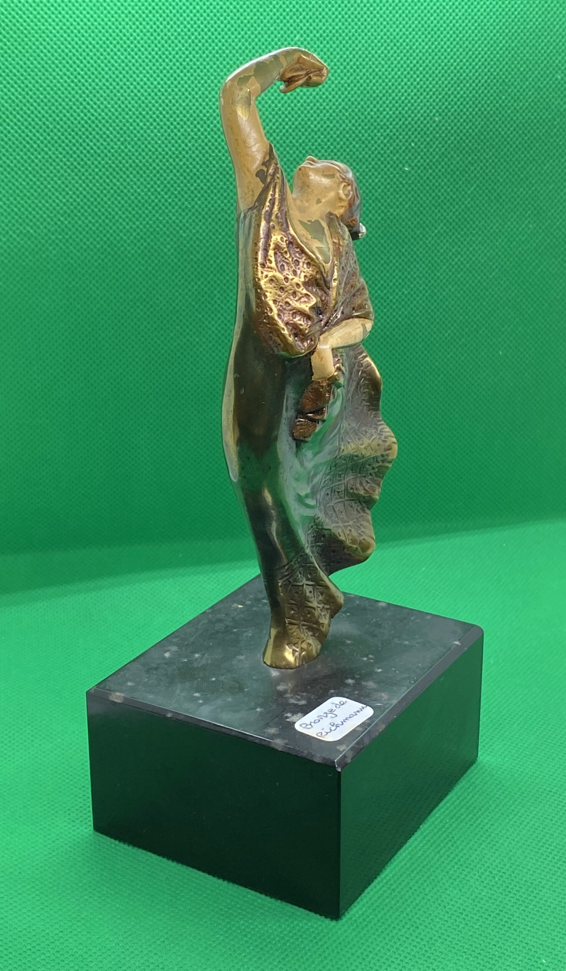 Prachtig antiek bescheiden Art Deco brons met emaille sculptuur op marmeren voet van een dansende dame van Ernst Rischmann. Het beeld heeft zeer mooie gedetailleerde gravures.Sculptuur is gegraveerd: 'bronze rischmann'.